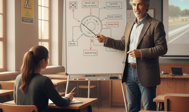 Instructor guiding a student driver through city traffic during a practical driving lesson.
